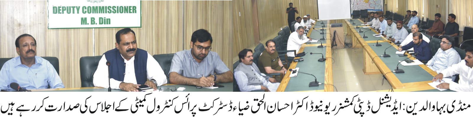 منڈی بہاوالدین( ایم.بی.ڈین نیوز 2 جون 2022 )حکومت پنجاب کی ہدایت کے مطابق گراں فروشی اور ذخیرہ اندوزی کو روکنے اور ضلع منڈی بہاوالدین میں پرائس کنٹرول کے موثر طریقہ کار کی نگرانی کے لیے نئی تشکیل پانے والی ضلعی پرائس کنٹرول کمیٹی کا اجلاس ایڈیشنل ڈپٹی کمشنر ریونیو احسان الحق ضیاء اور ضلعی رہنما مسلم لیگ ن سکندر حیات گوندل کی زیرصدارت منعقد ہوا۔