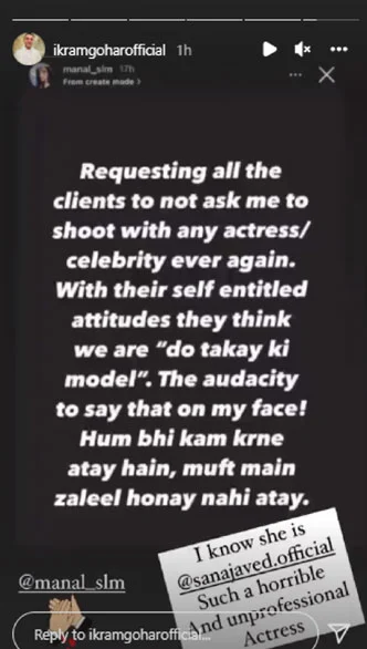 سماجی رابطے کی ویب سائٹ انسٹاگرام پراپنے ایک پیغام میں منال سلیم نے کہا کہ وہ تمام کلائنٹس سے گزارش کریں گی کہ آج کے بعد انہیں کسی اداکارہ یا سلیبرٹی کے ساتھ شوٹ کرنے کیلئے کبھی نہ کہیں کیونکہ یہ نام نہاد اداکارائیں ہمیں “دو ٹکے کی ماڈل” سمجھتی ہیں۔