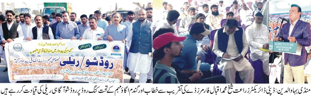 یاد رہے کہ زرعی یونیورسٹیزکے ساتھ محکمہ زراعت کی زیادہ گندم اگاﺅ مہم 5 نومبر تک جاری رہے گی۔ دریں اثناء زرعی یونیورسٹی فیصل آباد، بارانی زرعی یونیورسٹی راولپنڈی کے تعاون سے خصوصی گندم اگاﺅ مہم کے تحت کنگ روڈ پر ایک روڈ شو آگاہی ریلی کا انعقاد کیا گیا جس میں زراعت افسران سمیت کسانوں اور یونیورسٹیز کے طلباء و طالبات نے بھر پور شرکت کی۔