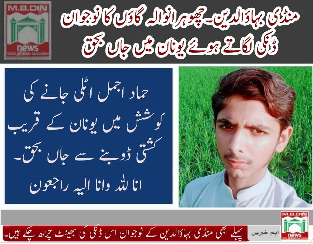 منڈی بہاءالدین ( ایم.بی.ڈین نیوز 15 اپریل 2022) منڈی بہاءالدین کا ایک اور نوجوان غیر قانونی طریقے سے ڈنگی لگاتے ہوئے یونان میں جاں بحق ہو گیا. حماد اجمل اٹلی جانے کی کوشش میں یونان کے قریف کشتی ڈوبنے سے جاں بحق ہو گیا.