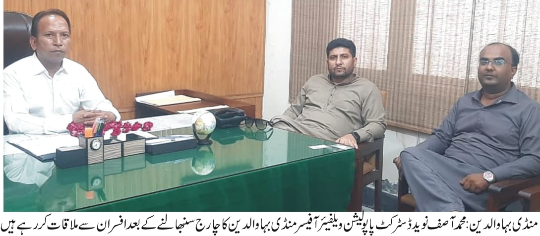 سیکریٹری پاپولیشن ویلفیئر پنجاب کے احکامات پر محمد آصف نوید ڈسٹرکٹ ڈیموگرافر پاپولیشن ویلفیئرآفیسر گجرات کو ڈسٹرکٹ پولیشن ویلفیئر آفیسر منڈی بہاوالدین تعینات کر دیاگیا۔ محمد آصف نوید عرصہ دراز سے ضلع گجرات میں تحصیل پاپولیشن ویلفئیر آفیسر، ڈپٹی ڈسٹرکٹ پولیشن ویلفیئر آفیسر اور ڈسٹرکٹ پاپولیشن ویلفیئرآفیسر کے عہدوں پر تعینات رہے ہیں۔